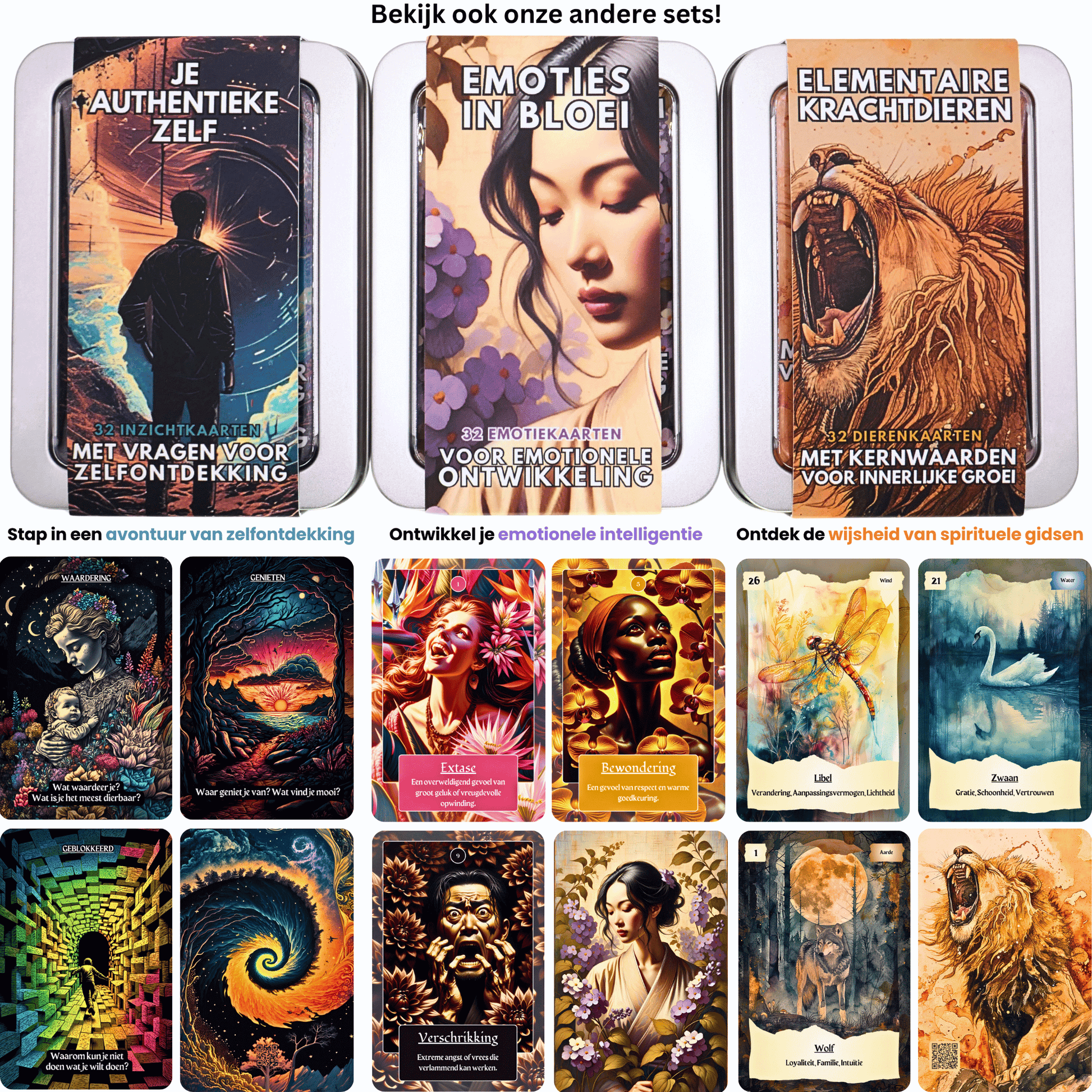 De korting geldt voor elke combinatie. Of je nou verschillende sets kiest, of juist meerdere exemplaren van dezelfde set—bijvoorbeeld voor je team, cliënten of als cadeau—alles is mogelijk!