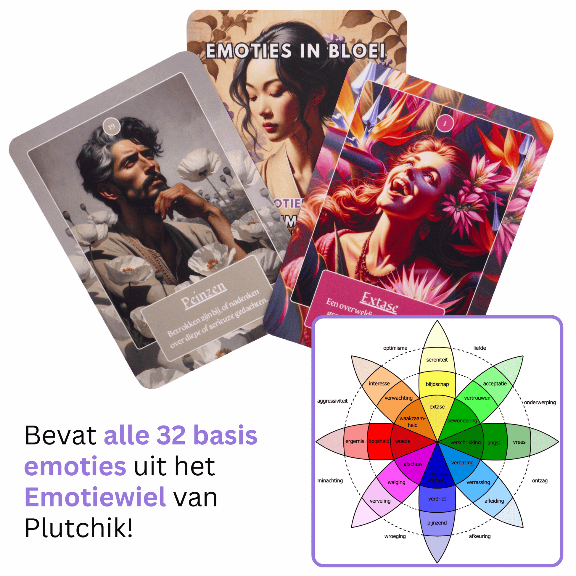 Deze unieke set emotiekaarten verbindt 32 verschillende emoties met een prachtige bloemenachtergrond en gezichtsexpressies, waardoor een nieuwe manier ontstaat om je eigen emoties te leren begrijpen en uiten. Elke kaart staat symbool voor een fundamentele emotie uit het emotiewiel, perfect voor het ontwikkelen van emotionele intelligentie en emotioneel bewustzijn.